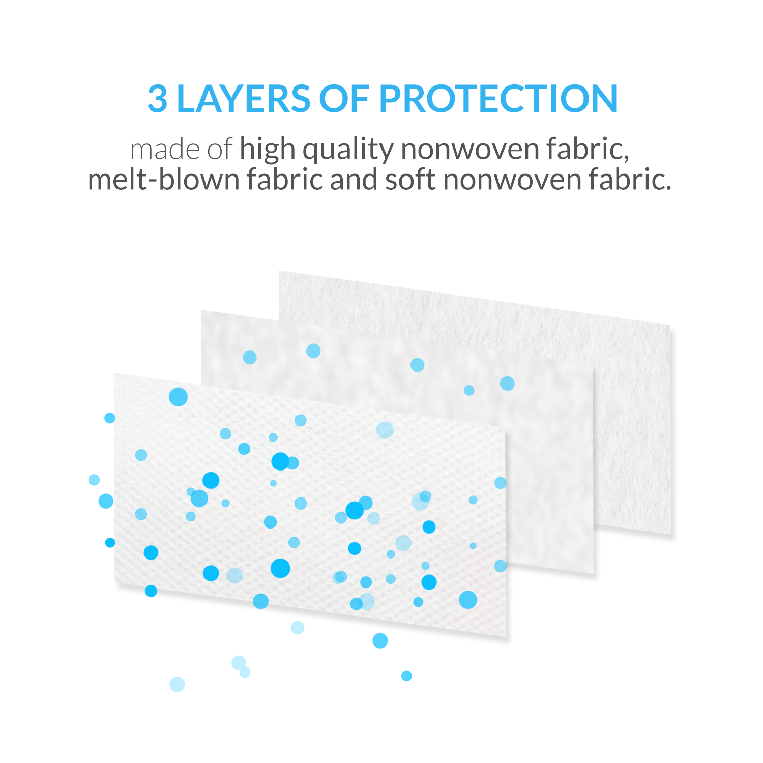 Breathable Three-Layer Masks: Outer color layer - water blocking layer which blocks splashing liquid in the air; Middle layer - filtering layer to filter particles in the air; Inner layer - water absorbing layer which can absorb hot air exhaled by the body, thus keeping the skin dry and comfortable
