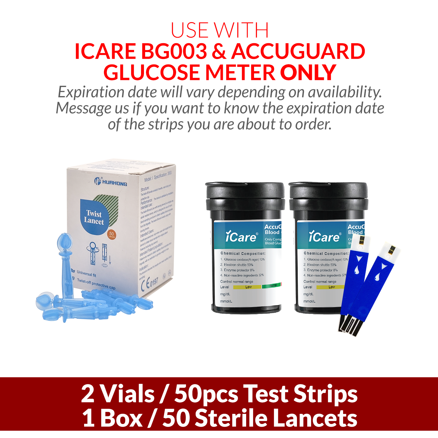 iCare AG-T50 50pcs Test Strips & 50pcs Lancets Compatible with BG003 and AccuGuard Blood Glucose Meter ONLY