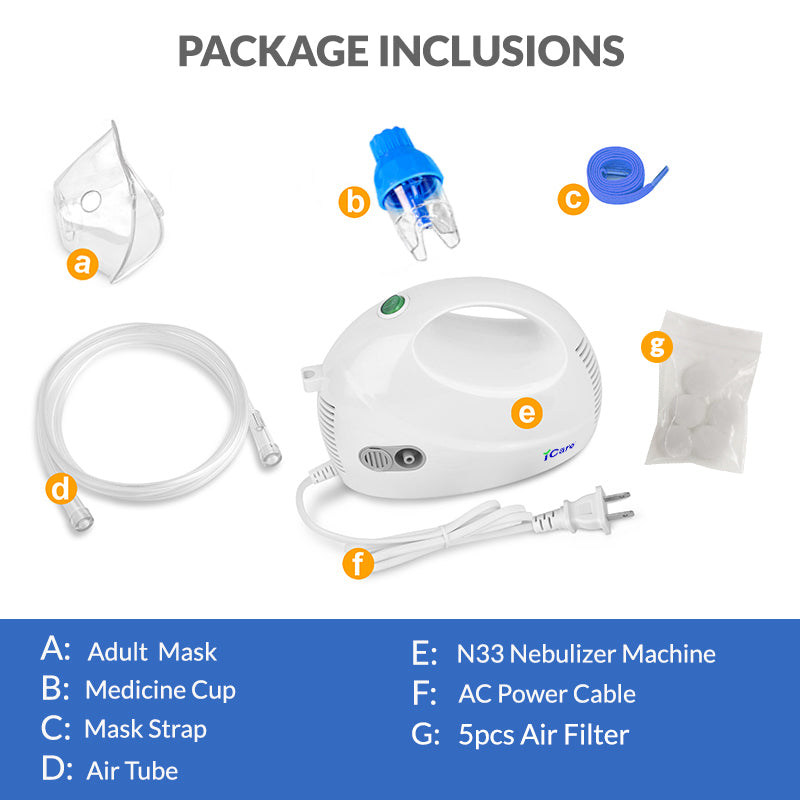 Standard Accessories: 1x N33 AeroCare Compressor Nebulizer, 1x Adult Mask, 1x Medicine Cup, 1x Oxygen Tube, 1x Strap, Air Filters (5)